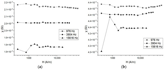 The most strongly magnetic, according to the magnetic susceptibility measurements, samples show a significant scattering in the Day–Dunlop diagram. The field dependencies of χ were measured for them at the three operating frequencies (976, 3904, and 15,616 Hz) of the excitation field. The presence of such dependencies can show the presence of particles in the ferrimagnetic phase which are in the superparamagnetic state and allow us to estimate the fraction of these particles [60,61,62,63]. Examples of such dependencies are shown in Figure 3.