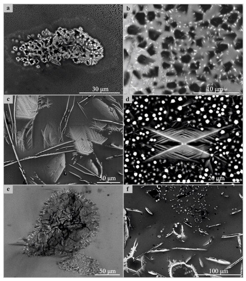 Iron oxides (hydroxides), magnetite, hematite, goethite, and others are visible on the glass surface. Morphologically, they appear as clusters of emulsion drops (a), microcrystallites (a, b), and skeletal aggregates (a, c, d, f) transforming into holohedral forms with a plate-like appearance (c, d). The plates often have hexagonal crystallographic faceting (b), from which it can be assumed that they are represented by hematite. Sometimes, there are relict areas of unmelted silica, around which microdrusy prismatic aggregates of silica (e), probably quartz, are growing. On the surface of these and in the interstices, iron oxides (hydroxides) are formed (e). The faces of earlier crystals are the intumescence surface for later ones. In comparison, the literature data on the artificial glasses obtained via the hydrothermal alteration of Martian-like synthetic basalts present a similar morphology [42]: iron mineral spherules a few micrometers in diameter. Moreover, Isobe and Yoshizawa showed the inclusions of sub-micrometer-sized iron oxide particles with the morphology of six-way petals or snowflakes [42], which can possess specific magnetic properties with several equivalent magnetic axes. Contrary to those results, Berger et al. [41] found nanosized isotropic magnesium ferrite inclusions in the glass structure, which can be superparamagnetic. Similar results regarding spherical iron oxide nanoparticles in magnetic macro/mesoporous bioglass have also been reported [36]. Additionally, the morphology of the obtained samples can be compared to the reduced basaltic glass incubated in vitro with Mariprofundus ferrooxydans, showing quite similar shapes and sizes to those of the iron oxide inclusions [31].