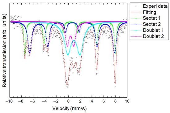 Figure 6 shows the Mössbauer spectrum for sample a30s10f as an example (other spectra are presented in Appendix A, Figure A1). The dots show the experimental data; the bottom line corresponds to the model spectrum.