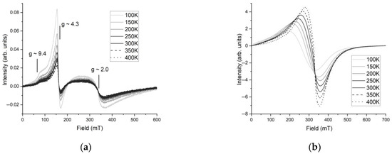 The two types of ESR spectra were obtained on the samples under study. The first type is the closest in form to the “classical” spectra of silicate glass with a small admixture of iron ions [67,68]. Such spectra were obtained for samples a30c10w, s30c10w, a30s10c5w, a10s30c5w, s30c10f, a20s20w, and a20s20f. Figure 7a shows an example of the spectrum measured at different temperatures for sample a30s10c5w. The intense line with g = 4.24 is characterized by the fact that its width of 17 mT does not change as the temperature decreases, and the intensity increases approximately by a factor of 4 in the range of 400–100 K. The less intense and broader line g = 2.0 (99 mT and 108 mT wide at 100 and 300 K, respectively) increases in amplitude less than 1.5 times in the same temperature range. A weak line with g~9.4 is also observed. The second type of spectrum is characteristic for the case of “ferromagnetic resonance”; for example, on magnetite particles, it was obtained for samples a10c30w, a30c10f, s10c30w, s10c30f, a10s30c5f, a30s10 c5f, a10s30c5f, and a10c30f (Figure 7b shows the ESR spectra for sample a30s10 c5f). The broad line with an intensity 2 orders of magnitude higher than that for the first type, with g = 2.09 at T = 300 K, shifts to the region of weak fields with g = 2.64, and has a decrease in amplitude by a factor of about 2 when the temperature changes to 100 K.