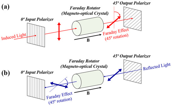 Principle of Faraday isolator using magneto-optical crystals as Faraday rotator. As the polarization of light is rotated by an angle of after propagated through the Faraday rotator, the induced light can pass through the output polarizer (a), meanwhile the reflected light will be shielded by the input polarizer (b).