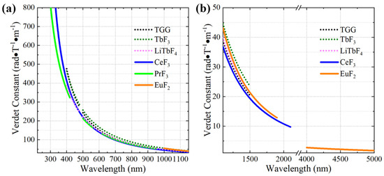 Verdet constants of several fluoride magneto-optical materials in UV-visible-NIR range (a) and mid-IR range (b). The dotted lines correspond with Tb3+-containing materials, whereas the Verdet constant dispersions of other magneto-optical materials are plotted by solid lines. The Verdet constant dispersions are plotted only within the transmittance range.