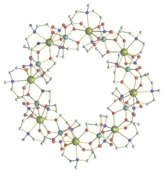 Since the 1980s, the field of molecular magnetism has witnessed great developments toward the characterization, understanding, and control of the magnetic properties of molecular magnets, with a major goal in using them for important applications, such as spintronics, quantum technologies, high-density data storage, and magnetic cooling. Distinguished from the traditional bulk magnets, crystals of molecular magnets are composed of identical molecules, which are magnetically isolated from each other by coordinating ligands and contain a certain number of organic or inorganic magnetic centers. As a consequence of the advances in coordination chemistry, many molecular magnets with different compositions and structures can be rationally designed and synthesized at the molecular scale. Paramagnetic metal molecular wheels are an intriguing family of molecular magnets with cyclic geometries and periodic boundary conditions, providing finite model systems for one-dimensional spin chains. In addition to the static magnetic properties stemming from their special structure, paramagnetic metal molecular wheels also exhibit remarkable spin dynamics at the crossover between classical and quantum regimes and possess fascinating quantum properties, holding much potential for both fundamental physics and quantum information processing applications [1,2,3]. The transition metal (3d) substituents form the largest and best-studied class of molecular wheels [4], while the lanthanide (4f) containing wheels are also fast developing [5]. By coupling 4f ions to 3d ions, heterometallic 3d-4f molecular wheels demonstrate interesting properties, such as slow magnetic relaxation owing to the large magnetic anisotropy of 4f ions [6], as well as toroidal magnetic moments that can simultaneously break time and space symmetries [7]. In this context, large hexadecametallic {M8Ln8} (M = 3d metal, Ln = 4f metal) wheels have been discovered and investigated in detail [7,8,9,10], demonstrating that the {M8Ln8} family represents an ideal playground for investigating the effect of magnetic ions and the exchange interaction on the resultant magnetic properties.