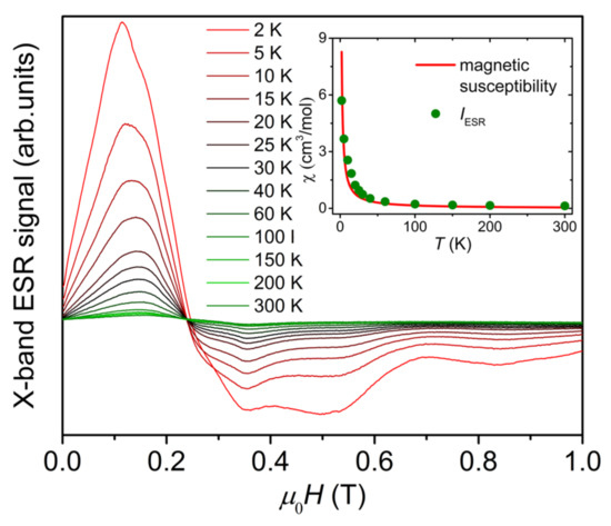X-band ESR first-order differential signal spectra of {Cr8Y8} measured at 9.4 GHz within 2–300 K. The inset is the temperature dependence of the integral intensity of the spectrum (IESR, green dots), together with the magnetic susceptibility curve (red line) adapted from Reference [9].