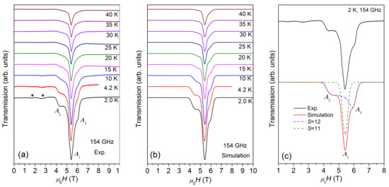 According to our earlier studies [10], the ground state of {Cr8Y8} is S = 12, the first excited state is S =11, and the other higher-order excited states are S = 10, 9, …etc. The energy gap between S = 12 and S = 11 is about 0.133 meV (1.54 K), which is quite small and lower than the lowest measurement temperature of 2 K. This means that the ESR spectrum at 2 K is contributed not only by the ground state of S = 12, but also by the S = 11 and possibly even higher order excited states. Thus, the analysis of ESR spectra is carried out by using Equation (1). To avoid over-parameterization, only S = 12 and S =11 are taken into account. The simulated spectra at 154 GHz are shown in Figure 3b and an example simulation of the 2 K spectrum is given in Figure 3c, where both S = 12 and S = 11 contributions are shown. The best simulation reproduces the spectrum at 2 K very well, yielding g = 2.03 and D = −0.069 K for S = 12 (weight 0.60 ± 0.05), and g = 2.03 and D ≈ 0 for S = 11 (weight 0.40 ± 0.04). The two weak low-field peaks marked with asterisks in Figure 3a are not considered in the simulation because their origin is not clear.