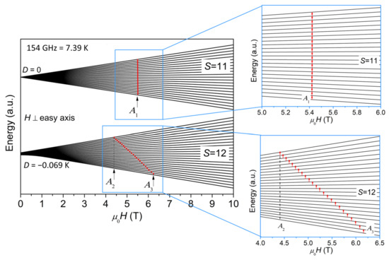 Figure 4 plots a schematic representation of the energy levels for S = 12 and S = 11 as a function of magnetic field (H⊥easy axis), where A1, A2, and A3 are marked with arrows. The case for H//easy axis is shown in Figure S1 in Supplementary Materials. The diagram for H⊥easy axis in Figure 4 explains how the ESR peaks are assigned, i.e., because the contribution from H⊥easy axis is dominant for powder ESR spectra, as noted earlier. For the sake of clarity, the S = 11 quantum levels are shifted along y axis to be set apart from the S = 12 quantum levels in Figure 4. The separation of S = 11 and S = 12 quantum levels does not affect the data interpretation or central purpose of this paper because of the ΔS = 0 selection rule for ESR. It should be noted here that we assume the effect of level crossing induced by the applied magnetic field is insignificant. Although we have not seen any sign of level crossing in the field dependence of magnetization [9] and the heat capacity at various external fields [10], we cannot rule out the possibility of level crossing, considering the fact that the temperature and field ranges of the previous magnetization and heat capacity investigations are limited and may not reach the conditions for level crossing to occur. If level crossing did play a role, additional ESR lines would appear [23]. However, our ESR spectra certainly do not have enough resolution to resolve these additional lines and identify level crossing. Therefore, more investigations will be needed to address the issue of level crossing in the future.