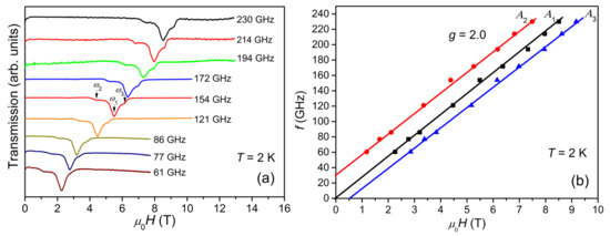 (a) ESR spectra collected at 2 K with frequencies varying from 61 to 230 GHz. (b) The f-H diagram: black squares, red circles, and blue triangles correspond to the central peak, A1, low-field peak, A2, and high-field peak, A3, respectively. The solid straight lines represent linear fits to the corresponding f-H plots.