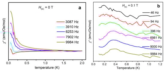 (a) Out-of-phase AC susceptibility χ” measured under zero external magnetic field with various frequencies from 50 mK to 2 K. The peak tails below 0.5 K may indicate fast quantum tunneling of magnetization (QTM) via degenerate energy levels. (b) Out-of-phase AC susceptibility χ” measured under 0.1 T external magnetic field with various frequencies from 46 to 9984 Hz in the temperature range of 0.1–1.2 K. Because the applied field suppresses QTM, the χ” peaks are visible and show frequency dependence, indicative of field-induced SMM behaviors.