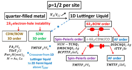 - Pouget, J.-P. Bond and charge ordering in low-dimensional organic conductors. Phys. B Condens. Matter. 2012, 407, 1762–1770. [Google Scholar] [CrossRef]