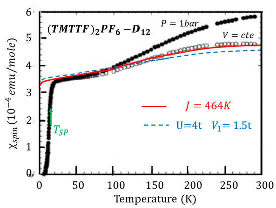 Temperature dependence of the spin susceptibility, χspin, of deuterated . The filled circles give the ambient pressure SQUID measurements, and the empty circles give the spin susceptibility at constant volume. The continuous red line is the fit of χspin with the expression of the spin susceptibility of the localized S—1/2 AF Heisenberg chain [17]. The adjustment shown in the figure, which takes into account both the absolute value and the thermal dependence of χspin, gives J ≈ 464 K [19]. The dotted blue line is the fit of χspin for the 1D extended Hubbard model, as detailed in note [23].