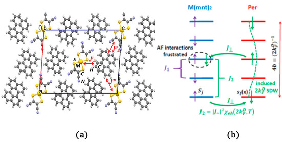 A very original family of 2:1 charge transfer salt is the α-Per2-M(mnt)2 series, whose array projected perpendicularly onto the chain direction is shown in Figure 6a. It contains a metallic quarter-filled Per stack subject to a Peierls instability and dithiolate chains. For M = Au and Cu close shell dithiolate molecules are non-magnetic, while for M = Pt, Ni and Pd dithiolate derivatives, localized S = 1/2 chains with AF interactions are formed (Figure 6b). Such a coupled stack array presents very original physical properties which are reviewed in [1,33]. It exhibits, in particular, three types of substantial interchain exchange interactions J⟂┴ (named J′, J″ and J‴ in Figure 6a), whose importance is assessed by the observation of a single EPR line at a g value intermediate between those of dithiolate and Per molecules in the Pd [34] and Pt [35] derivatives. This coupling allows a subtle interplay between Peierls and spin-Peierls instabilities, respectively, located in the Per and M = Pt, Ni and Pd dithiolate stacks [36]. In this respect, and based on the finding of substantial J⟂ values, a Kondo-type of inter-chain magnetic coupling (Figure 6b) was proposed to be a relevant interaction in the Pt salt [35]. However, it was recently realized [25] that most visible effects arise from Per-dithiolate Kondo coupling in the less studied Ni and Pd salts. In them, the SP instability occurs in the adiabatic regime, at the difference of the non-adiabatic SP regime of the Pt salt [25].