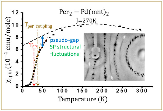 Here, we consider specifically the Pd salt, where the effects of SP instability and of Kondo coupling are very remarkable. Figure 7 shows the thermal dependance of the spin susceptibility of the Pd salt obtained from ref. [36]. At high temperature, χspin follows the thermal dependance of the spin susceptibility of the S = 1/2 AF Heisenberg Hamiltonian (1) with J = 270 K (J1 in Figure 6b). Then, below ~100 K χspin drops strongly when 1D SP structural correlations on the Pd(mnt)2 stack develop [37] (see insert of Figure 7). This behavior bears some resemblance to that exhibited by (BCP-TTF)2AsF6 below (Figure 4), with, however, a larger rate of decrease of χspin. The rate of decrease is enhanced below about 40 K, as revealed by a change of slope (brown dotted lines in Figure 7). This behavior is ascribed to the relevance of the Per-dithiolate exchange Kondo interaction, which sets a J2 AF interaction of the same sign as J1 (see Figure 6b and ref [25] for more detail). This induces a drop of χspin which is so rapid that, at the SP transition of 28 K, only 1/3 of χspin remains (this is different to (BCP-TTF)2AsF6, where, without AF frustration, 90% of χspin remains at TSP—see Figure 4).