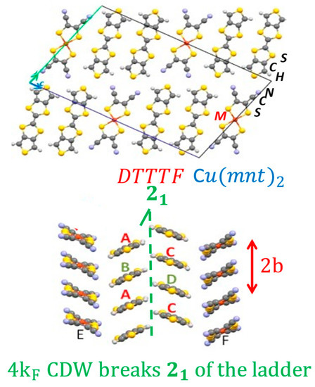 More complex behaviors, not yet completely understood, are found in the DTTTF2-M(mnt)2 series with M = Pt and Ni [46,48]. As for the Per2-M(mnt)2 materials with the same M (Section 5), the complexity arises from the additional presence of dithiolate paramagnetic ions forming an S = 1/2 AF chain, which compete with the frustrated AF interactions previously found in the donor ladder. DTTTF2-M(mnt)2 with M = Pt and Ni is a better conductor than the Au and Cu analogues. However, they still exhibit a metal–insulator transition, but at a twice smaller [46,48]. In the Pt derivative the transition stabilizes the 2b periodicity as for the Cu and Au derivatives [46]. However, the Pt and Ni salts exhibit two interacting magnetic subsystems, as shown by EPR measurements for which the width of the single line is observed to increase dramatically as the conductivity increases. Both salts show two different types of AF interaction, and at a lower temperature exhibit a transition not yet fully understood: it is possibly of the AF type in the Ni salt and of the SP type in the Pt salt. The SP instability of the ladder found in the Au and Cu derivatives is apparently less stable in Pt and Ni derivatives. However, it could be restored by the dimerization of the dithiolate stack, setting a 2b SP lattice periodicity, as for Per2-M(mnt)2. However, the Pt derivative exhibits upon cooling an enhanced disorder between neighboring stacks, which is certainly caused by frustrated coupling between dimerized dithiolate and DTTTF stacks.