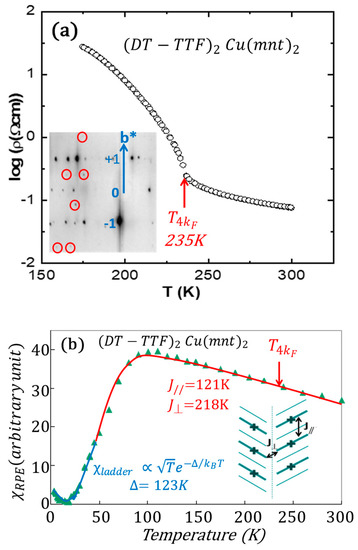 Thermal dependance of the logarithm of the resistivity (a) and of the RPE spin susceptibility (b) of DTTTF2-Cu(mnt)2 (data originally published in ref. [41,42], respectively, are kindly provided in a modified form by M. Almeida). The b*/2 superlattice reflections appearing below are shown (red circles) in the X-ray pattern of the insert of figure (a). The thermal dependance of χRPE if fitted at high temperature by χspin of the frustrated ladder (red curve) with J⟂ and J// is represented in the figure, and at low temperature by χladder (blue curve), whose analytical expression is given. In (a), the weak increase of resistivity on approaching from higher T could be due to the development of a pseudo-gap, due to 4kF fluctuations in the metallic state.