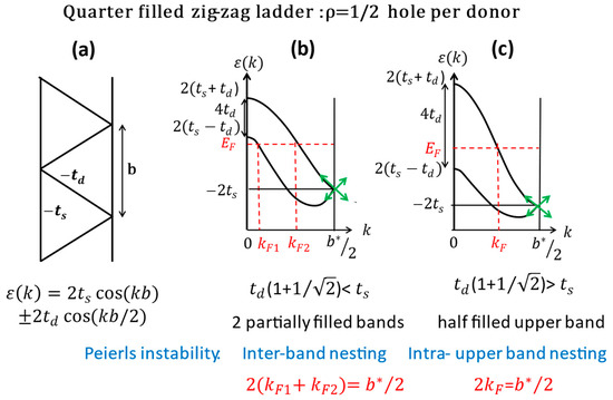 Band structure of the quarter fill zig-zag ladder shown in (a). With one-half hole per donor and for decreasing ratio of transfer integrals ts/td one shifts from a two partially filled band structure (b) to a half-filled upper band structure (c). The Peierls instability is achieved by an inter-band nesting process in (b) and by an intra-upper band nesting process in (c). For half a hole per donor, both FS nesting processes always occur at b*/2.