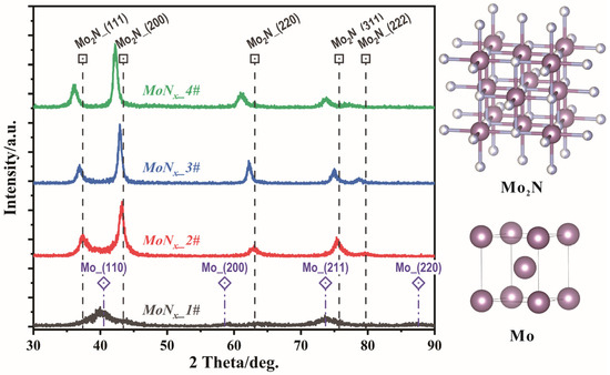 - Wang, T.; Zhang, G.; Ren, S.; Jiang, B. Effect of nitrogen flow rate on structure and properties of MoNx coatings deposited by facing target sputtering. J. Alloys Compd. 2017, 701, 1–8. [Google Scholar] [CrossRef]