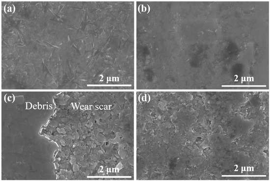 SEM surface images of (a,c) inside and (b,d) outside wear tracks of the MoNx_1# coating after rubbing at (a,b) 400 °C and (c,d) 500 °C.