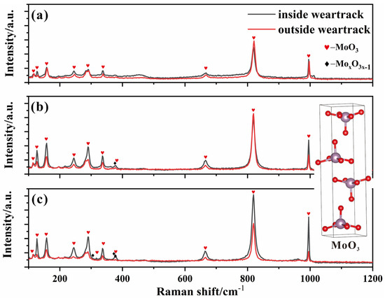 Figure 8 displays the Raman spectra for the interiors and exteriors of the wear scars of the (a) MoNx_2#, (b) _3#, and (c) _4# coatings after the friction tests at 400 °C. In the Raman spectra, the MoO3 peaks formed by the friction process were primarily located at 666, 820, and 996 cm−1 [44]. The researchers induced the transformation of m−MoO2 to α−MoO3 through continuous laser irradiation and observed Raman peaks corresponding to the crystalline phase of α−MoO3 at 152, 280, 660, 819, and 995 cm−1. α−MoO3 exhibited a layered structure [40] that was susceptible to shear and thus promoted lubrication owing to the formation of layers that were bound to each other by van der Waals forces. Overall, the intensity of the MoO3 peaks within the abrasion marks of the three groups of samples (4# > 3# > 1#) corresponded to the magnitude of the friction coefficient. In addition, more MoO3 and oxygen-deficient oxides formed within the wear tracks of the MoNx_4# sample, thereby resulting in its lowest COF. δ−MoN was susceptible to oxidation at 400 °C [40], and the mixture of the high proportion of cubic phase with the low proportion of hexagonal phase underwent enhanced oxidation at 400 °C [41].