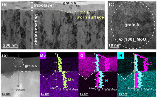 The tribolayer on the MoNx_4# coating after the ball-on-disc test at 400 °C was investigated through TEM and STEM, as displayed in Figure 10. A tribolayer with a thickness of approximately 100 nm on the MoNx coating was observed in the bright-field image (Figure 10a). Figure 10b displays the EDS compositional mapping and the EDS line-scan compositional profile of the tribolayer, indicating that the tribolayer mainly consisted of Mo and O. Figure 10c displays nanocrystalline grains A, which were essentially MoO3 nanocrystals with (100) planes as the selective orientation and corresponded to MoO3 with a needle-rod structure, as displayed in Figure 7a. Some poorly crystalline MoO3 was observed around nanocrystals A. The MoO3 did not tend to grow and dominated the entire friction layer, thereby forming a dense friction layer. This thin and dense friction layer blocked the diffusion of oxygen into the coating and thus caused the low wear of MoNx coatings at 400 °C. At 500 °C, a well-crystallized loosely structured porous friction layer was formed (Figure 7b), thereby resulting in reduced performance and severe oxidative wear of the MoNx coating, and the liquefaction of the oxide resulted in a low COF, but its adhesion led to an increased coefficient of friction.