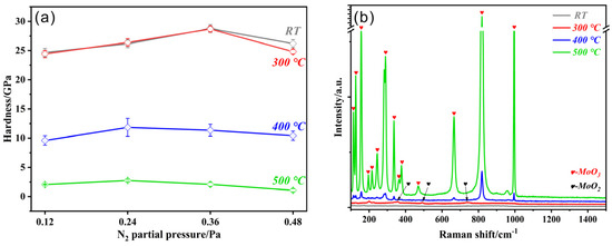 (a) Hardness of MoNx coatings after rubbing at different temperatures. (b) Raman spectra in the interior of the wear marks of MoNx_4# rubbed at different temperatures.