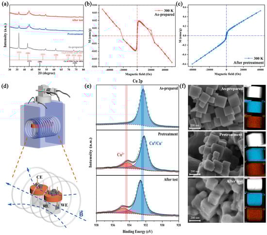 Material characterization of the catalyst: (a) XRD pattern of the as-prepared, pretreated and after-test catalyst. (b,c) The M(H) curves at 300 K of the as-prepared and pretreated catalyst. (d) The schematic diagram of the magnetic field device and electrochemical H-cell. (e) XPS spectra of Cu 2p of the as-prepared, pretreated and after-test catalyst. (f) SEM images and EDS mapping of the as-prepared, pretreated and after-test Cu2O nanocubes.