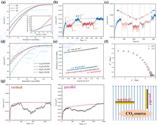 Electrochemical characterization of the catalyst under different magnetic fields. (a) LSV curves and magnetocurrent curves under 0 T, 1 T, and 3 T magnetic fields. (b) Plot of current density vs. time in a 1 T intermittent magnetic field; the yellow arrow corresponds to the switching time. (c) Plot of current density vs. time in a magnetic field; the gray area corresponds to the interim time. (d) LSV curves of Cu2O and Bi2O3 with/without a magnetic field. (e) Tafel slope of Cu2O under different magnetic fields. (f) EIS plot of Cu2O under 0 and 3 T magnetic fields. (g) Plot of current density vs. time in vertical and parallel orientations toward the magnetic sensing line.