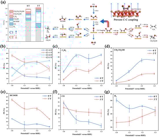 The CO2RR has an intricate reaction path (Figure 3a) [,]. It is currently believed that the activation of a CO2 molecule is the first step. The adsorbed *CO2 is reduced to *OCHO or *COOH, which is further reduced to HCOOH and *CO, respectively [,]. Additionally, *CO is an important intermediate in the CO2RR, and it can be reduced to a C1 product (CH3OH and CH4) via subsequent proton-coupled electron transfer or it forms CO by desorption. Moreover, a pair of *CO on neighboring active sites can further couple to form C2+ (C2H4 and CH5OH) products [,,,,,,]. We collected the products in various potentials with/without a magnetic field in a high overpotential region (−1.0 VRHE–−1.3 VRHE). The contrasting result (Figure 3b) shows that the Faraday efficiency of the C1 product (HCOOH and CO) is increased significantly with the decreasing Faraday efficiency for the H2 and C2+ products (C2H4, C2H5OH, and C3H8O). The detailed data are displayed in Figure 3c–g.