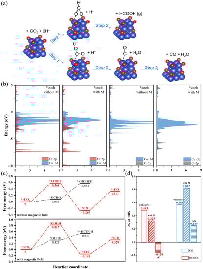 In this regard, magnetic fields have an omnifarious effect on the CO2RR. In fact, due to the different chemical composition of the free radical pairs, the frequency of Larmor precession is inconsistent, which leads to the spin states being transformed between singlet and triplet states. A magnetic field can speed up flipping between the free radical spin states [,]. As such, we can obtain a higher current density [] and yield of the target product in the magnetic field. Pan et al. found that a 0.9 T magnetic field can accelerate the combined rate of a COO/H· radical pair on a Sn nanosheet, thus increasing the yield of formic acid by 99.9% []. Moreover, by polarizing unpaired electrons on the catalyst surface, we can alter the adsorbed intermediates in the same spin direction. On account of the triple-state oxygen molecula, the spin polarization effect is mainly applied to OER. Galán-Mascarós et al. tested a range of Ni-Fe oxides with magnetic fields and found that the magnetocurrent is positively correlated with the magnetic property of the catalyst. They attributed this phenomenon to the lower energy barrier to form O–O bonds on the spin parallel neighboring sites []. In addition, the experimental results and the DFT data of Yang et al. also proved that the M-3d and O-2p orbitals of spin-polarized CoFe2O4 nanoparticles show stronger hybridization, thus facilitating spin-selected charge transport [].