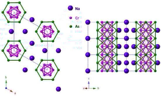 The crystal structure of NaCrAs is shown in the left panel of Figure 1, which crystallizes in the hexagonal non-centrosymmetric structure with space group P-6m2 (No. 187), in which the (CrAs) linear chains are separated by Na ions. Structurally, ACrAs have a typical Q1D configuration originated from the 1D CrAs chains that crystallize in a fashion of double-wall subnanotubes, with the alkali metal ions located among the interstitials of the CrAs chains []. The upper critical field ∼54 T exceed the Pauli paramagnetic limited = 1.84 16 T [], suggesting strongly coupled superconductivity in NaCrAs, which is also observed previously in ACrAs (A = K, Rb, Cs) and ACrAs (A = K) superconductors []. Strong electron correlation effect is evident from large value of the Sommerfeld coefficient as 76.5 mJ/(mol-K) in NaCrAs [], this is a common feature in ACrAs compounds due to reduced dimensionality []. In ACrAs series, increases dramatically from 2.2 to 8.0 K from Cs to Na indicating substantial positive chemical pressure effect on and interchain coupling [].