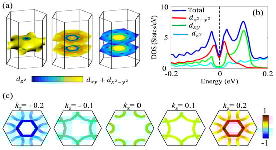 Earlier electronic structure calculations have shown that the low-energy properties are defined by a minimal three-band model, stemming mainly from the , , and orbitals of the Cr-atoms [,,,]. We adopt the three-band tight-binding model from Ref. [] and the theoretical details are given in the Appendix A. The corresponding Fermi surfaces (FSs) are shown in Figure 4a, with a gradient color denoting the corresponding orbital weight. Interestingly, there lie two flat FS sheets at constant cuts which have weak basal plane anisotropy. Such FSs govern strong peaks in the density of state (DOS) at the Fermi level, and hence ferromagnetic fluctuations. In addition, due to the separation of the flat FS sheets between the nearly constant direction, there arises strong FS nestings around , where . Such a nesting promotes magnetic fluctuation mediated pairing channel which follows the relation . Through numerical calculation, we show below that the pairing symmetry turns out to be in nature with triplet pairing channel but for . We notice that the FS topology of this material is qualitatively similar to the iso-structural heavy-fermion superconductor UPt [,] in which also unconventional p-wave pairing symmetry due to FM fluctuation has been discussed before [,].