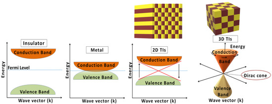 TIs are unique substances different from the typically three types of solid materials: conductors, insulators, and semiconductors [4] (Figure 1). The mobility of free electrons is independent of the band separation crossing. Because of the large separation between occupied and unoccupied states, an insulator cannot conduct electricity. Energy must be taken up by the electron in order to make a jump from the maximum occupied energy to the least occupied energy state. The band gap of the semiconductor is between that of the conductor and the insulator as shown in Figure 1. However, the TIs defy easy categorization within any of these groups. TIs possess bulk electronic states with a tiny band gap, indicating that the bulk states do not contain free carriers. However, they also have metallic surfaces that are topologically shielded. A Dirac point Figure 1 that can cross the band gap is present in this gapless surface state, proving that the TI surface is conductive [5] and a unique surface state as a result of T-symmetry and high order spin orbit coupling (SOCs) in its interior is produced. This clearly indicates that TIs can minimize or eliminate the dispersion of non-magnetic contamination [6].