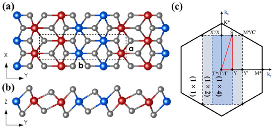 (a) Monolayer 1T’ MM’X4 compounds are shown in top. The a and b represent the lattice parameter of the unit cell in x and y direction respectively. (b) side views where M is Nb, Ta or V, is Ir or Co, and X is Te. (c) The BZs for 1 1 1T-MX2 are indicated by solid lines. The 1 2 (1T’-MX2) and 1 4 (MM’X4) smallest repeated cell dashed lines enclosing their Brillouin Zones are cover in grey and blue, colour. The high symmetry points of 2D TMDs are marked with stars (*) and primes (’), respectively [53] (© 2021 The Physical Society of the Republic of China (Taiwan). Published by Elsevier B.V. All rights reserved).