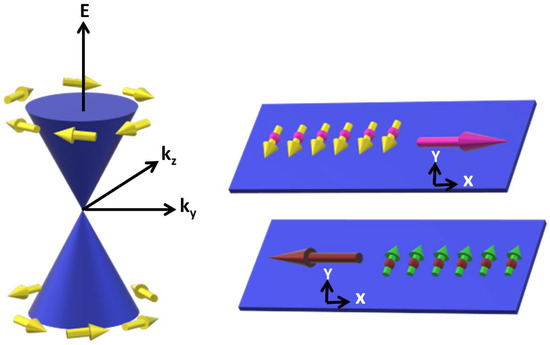 TIs are a new class of materials that contain novel quantum states. Gapless Dirac surface states shielded by T-symmetry are created as a result of a nontrivial band topology and strong SOCs, and surface conductions display unusual spin-momentum locking properties, as shown in Figure 9 [93].