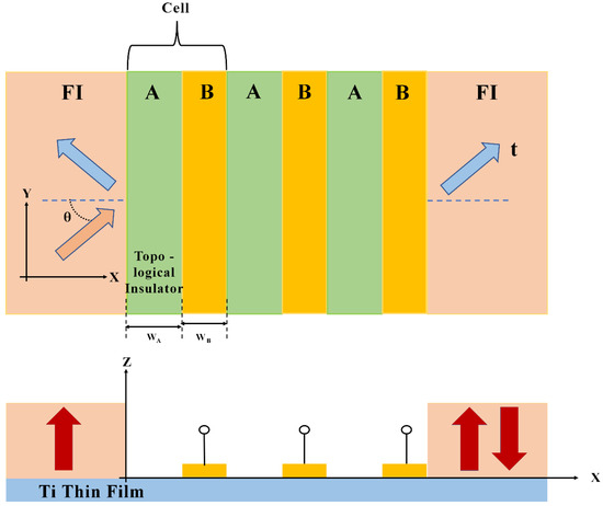 The TIs thin film spin valve with a 3-cell top gate is represented schematically in terms of its device profile. The unit cell (A/B) in this system is assumed to be the normal and top-gate potentials. The grey electrodes that represent the top gates on the TI surface provide squared gate voltages (Vg). The spin valve receives spin electrons at an incidence angle of (FI-ferromagnetic insulator) [101] (Copyright © 2021, The Author(s)).