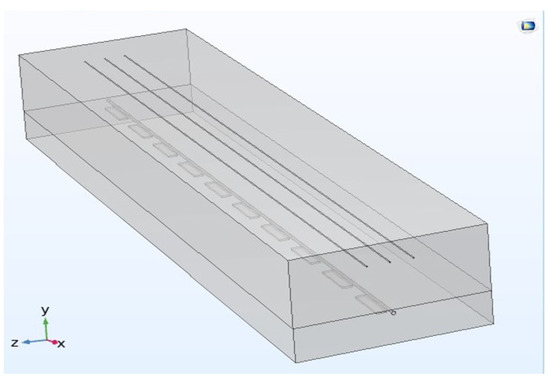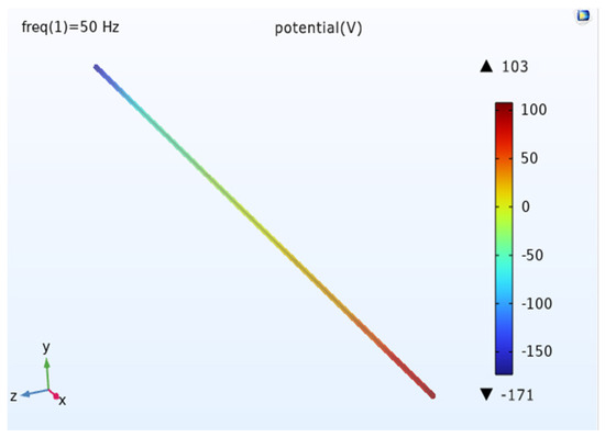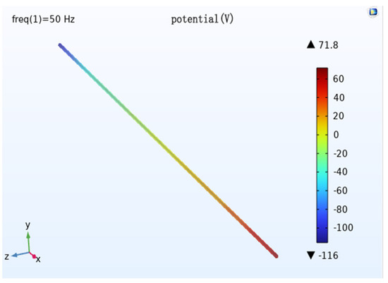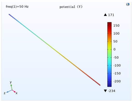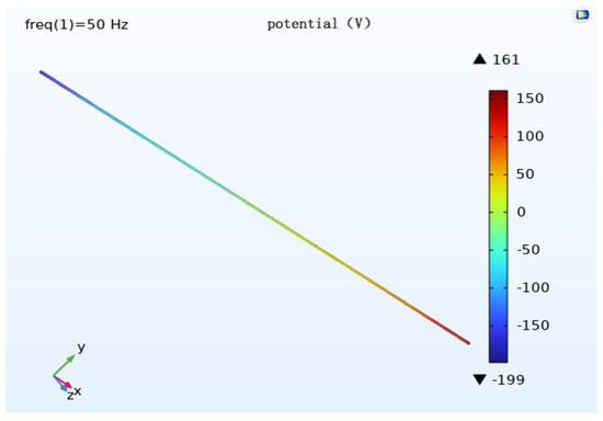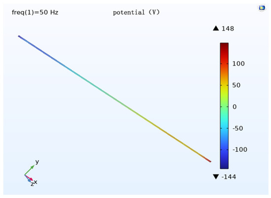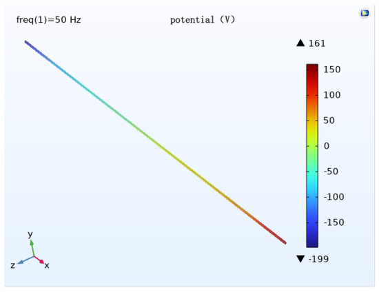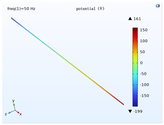 The modeling of the geometric model is done using COMSOL (Figure 3), which consists of a pipe, transmission conductor, auxiliary anode, soil, and air domain. The top half of the model is the three transmission lines and the air domain, the bottom half is the pipe, and the auxiliary anode buried in the soil domain. Add a layer 0.1 m above the bottom of the soil domain and define the very small domain formed by this layer and the bottom of the soil as the infinite source domain, which can be regarded as infinite and has a uniform soil resistivity. Set the bottom surface of the soil domain as the potential zero, i.e., the potential zero is defined at the infinity of the soil. The size of the air domain is 400 m × 40 m × 100 m, the size of the auxiliary anode is 25 m × 1 m × 5 m, and a total of 10 groups are buried. The selected pipe length is 400 m and the transmission line stall distance is 400 m.