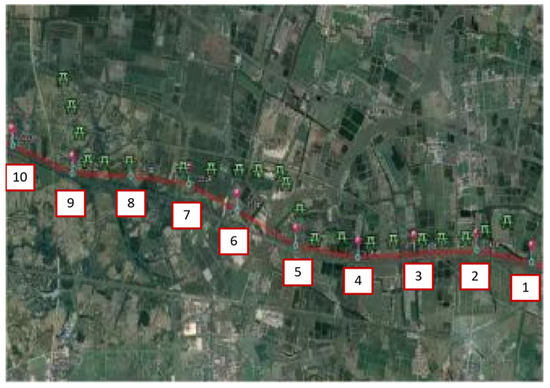 Figure 5 shows the distribution of a section of the transmission line and the long transmission pipeline in the 1000 kV Southeast Jinan–Nanyang–Jingmen EHV AC test demonstration project in China. The red lines indicate the buried route of the pipeline, the green line segments indicate the transmission line erection route, and the blue dots indicate the test pile locations. The authors went to the site to measure parameters related to electromagnetic induction in long-distance transmission pipelines, such as the height of transmission lines, soil resistivity and burial depth of pipelines, and collected the induction voltages of pipelines measured at different cathodic protection test stakes. The collected parameters were substituted into the established COMSOL model for simulation calculations and compared with the data measured at the test piles.