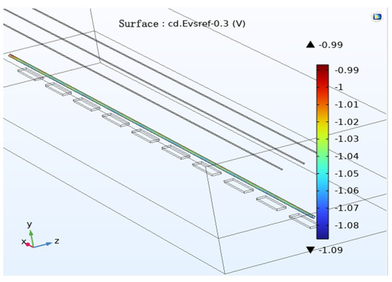 The secondary current distribution interface in the COMSOL Multiphysics electrochemical corrosion module was used to build a cathodic protection system using the applied current protection method. Calculated parameters, such as equilibrium potential, exchange current density, Tafel slope and oxygen reference concentration, are brought into the kinetics that are built-in to the Tafel electrode kinetic equations for cathodes and Butler–Volmer polarization. The kinetic principle boundary conditions for the steady state calculation of the electrode reaction at the interface between the metal material and the electrolyte are also involved. The pipeline potential distribution when the pipeline is not subjected to AC electromagnetic interference can be obtained, and the pipeline potential is within the effective protection zone of −0.85 V to −1.2 V (Figure 6).