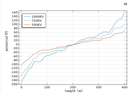Analysis of the pipeline cathodic protection potential distribution diagram (Figure 17, Figure 18 and Figure 19) and its comparison diagram (Figure 20) shows that the maximum value of the induced voltage on the pipeline appears at the two ends of the pipeline with the remaining calculated parameters unchanged, the AC induced voltage at the middle of the pipeline is 0, and the induced voltage increases continuously from the middle of the pipeline to the two ends of the pipeline. The greater the distance of the transmission line from the ground, the weaker the induced voltage on the pipeline, and the smaller the cathodic protection potential offset. The potential has deviated from the effective protection zone, and the pipeline cathodic protection fails.