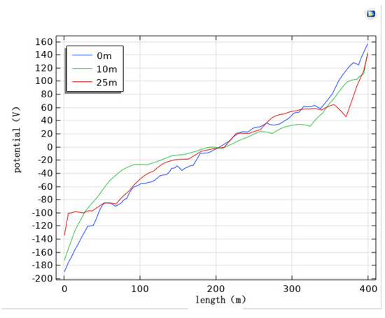 Analysis of the pipeline cathodic protection potential distribution diagrams (Figure 25, Figure 26 and Figure 27) and the comparison diagram (Figure 28) shows that the maximum value of the induced voltage on the pipeline appears at the two ends of the pipeline with the remaining calculated parameters unchanged, and the AC induced voltage at the middle of the pipeline is 0. The induced voltage increases continuously from the middle of the pipeline to the two ends of the pipeline. The deeper the burial depth, the weaker the induced voltage on the pipeline, and the smaller the cathodic protection potential offset. The potential has deviated from the effective protection zone, and the pipeline cathodic protection fails.