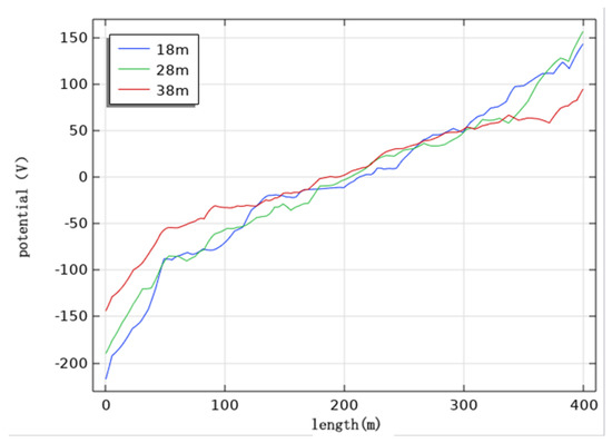 In order to study the effect of transmission line height on cathodic protection potential, the burial depth is 2 m, the voltage level of the transmission line is 1000 kV, the parallel spacing is 0 m, and the wire arrangement is horizontal, as in the initial condition, and the pipeline cathodic protection potential distribution is simulated when the wire height is 18 m, 28 m and 38 m, respectively.