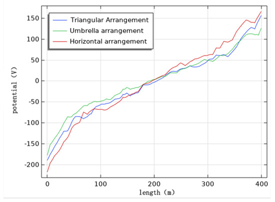 In order to study the influence of wire arrangement on the cathodic protection potential, the initial condition is a burial depth of 2 m, transmission line’s voltage level of 1000 kV, parallel spacing of 0 m, and line height of 28 m. The wire arrangement is simulated as horizontal, umbrella and triangle respectively when the pipeline cathodic protection potential is distributed.