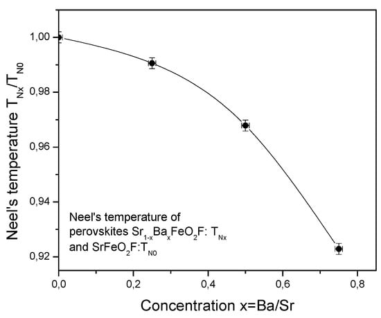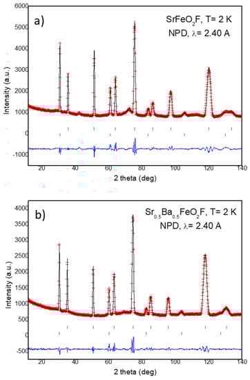 - García-Ramos, C.A.; Retuerto, M.; Alonso, J.A. On the Sr1−xBaxFeO2F Oxyfluoride Perovskites: Structure and Magnetism from Neutron Diffraction and Mössbauer Spectroscopy. Materials 2016, 9, 970. [Google Scholar] [CrossRef]