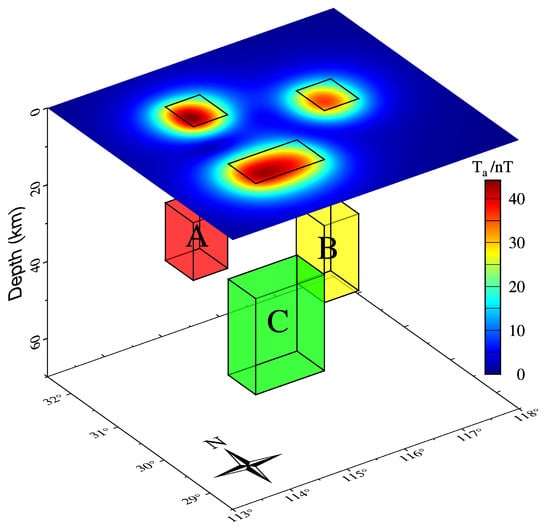 The remainder of this paper is as follows: a brief introduction of this inversion method and a synthetic model, and experiments with inversion of three-component magnetic anomaly data sets, are presented in Section 2. Section 3 details the tectonic setting of the Dabie orogen and the characteristics of the lithospheric vertical component magnetic field. The validity of the magnetic sources’ depth is analyzed in Section 4. We discuss the interior 3D magnetization structures of the orogen in Section 5. Section 6 clarifies the tectonic evolution processes related to the origin of central magnetic bodies. Finally, in Section 7, we present the conclusions of this study. The main objectives of this study are to recover the magnetic sources in the orogenic lithosphere and analyze the relationship between the magnetic bodies and tectonic activities.