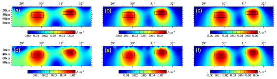 Horizontal slices of inversion results for three-component magnetic anomalies (depth = 37.5 km): (a–c) inversion results of , , and without noise; (d–f) inversion results of , , and with 5% noise signal.