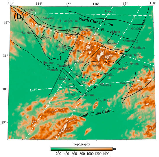 (a) Simplified geological map of the Dabie orogen (modified from [57]); (b) topographic map of the Dabie orogen. F1. Xinyang–Shucheng fault zone; F2. Xiangfan–Guangji fault zone; F3. Dawu fault; F4 Tancheng–Lujiang fault zone; F5. Tongbai–Shangcheng–Mozitan–Xiaotian fault zone; F6. Shangcheng–Macheng–Tuancheng fault zone; F7. Wuhe–Shuihou fault zone; F8. Huoshan–Luotian fault zone; F9. Feizhong fault zone; F10. Jiangnan fault zone; F11. Gegong fault. Note: in the figure, the white dashed lines show the positions of the studied profiles.