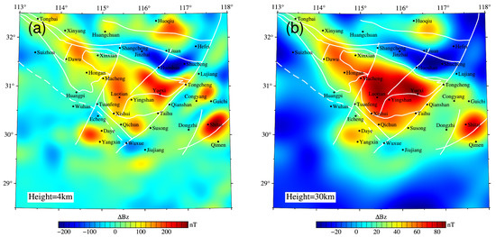 Distribution of the lithospheric vertical component magnetic anomalies in the Dabie orogen: (a) calculation results at the height of 4 km; (b) calculation results at the height of 30 km.