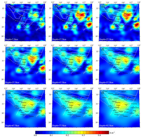 Horizontal slices of 3D magnetization inversion at different depths: (a–h) divided horizontal slice results for depth starting from 7.5 km and increasing by 10 km, respectively; (i) slicing result at a depth of 92.5 km. Note: the white lines are a series of faults.