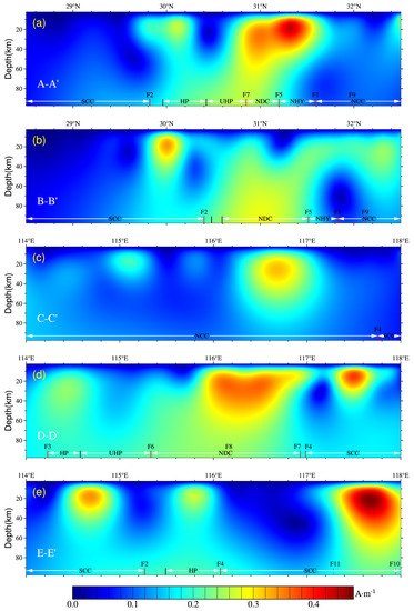 Vertical slices of 3D magnetization inversion along the profile lines: (a–e) correspond to the profile lines in the topographic map, respectively. SCC—South China Craton; NCC—North China Craton; NHY—northern Huaiyang tectonic belt; NDC—northern Dabie complex unit; HP—high-pressure metamorphic belt; UHP—ultrahigh-pressure metamorphic belt; F1–F11 represent fault zones.