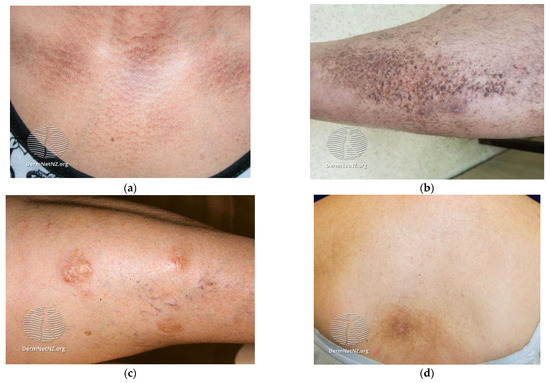 Typical examples of primary localized cutaneous amyloidosis: (a) macular amyloidosis; (b) lichen amyloidosis; (c) nodular amyloidosis; (d) area of notalgia paraesthetica in macular amyloidosis. Available from dermnetnz.org (accessed on 13 February 2023), a free dermatology resource.
