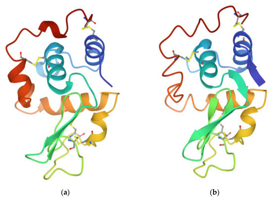 Structures of (a) human lysozyme 1LOZ and (b) hen egg yolk lysozyme 1LYZ, available from the RSCB Protein Data Bank archive [28].